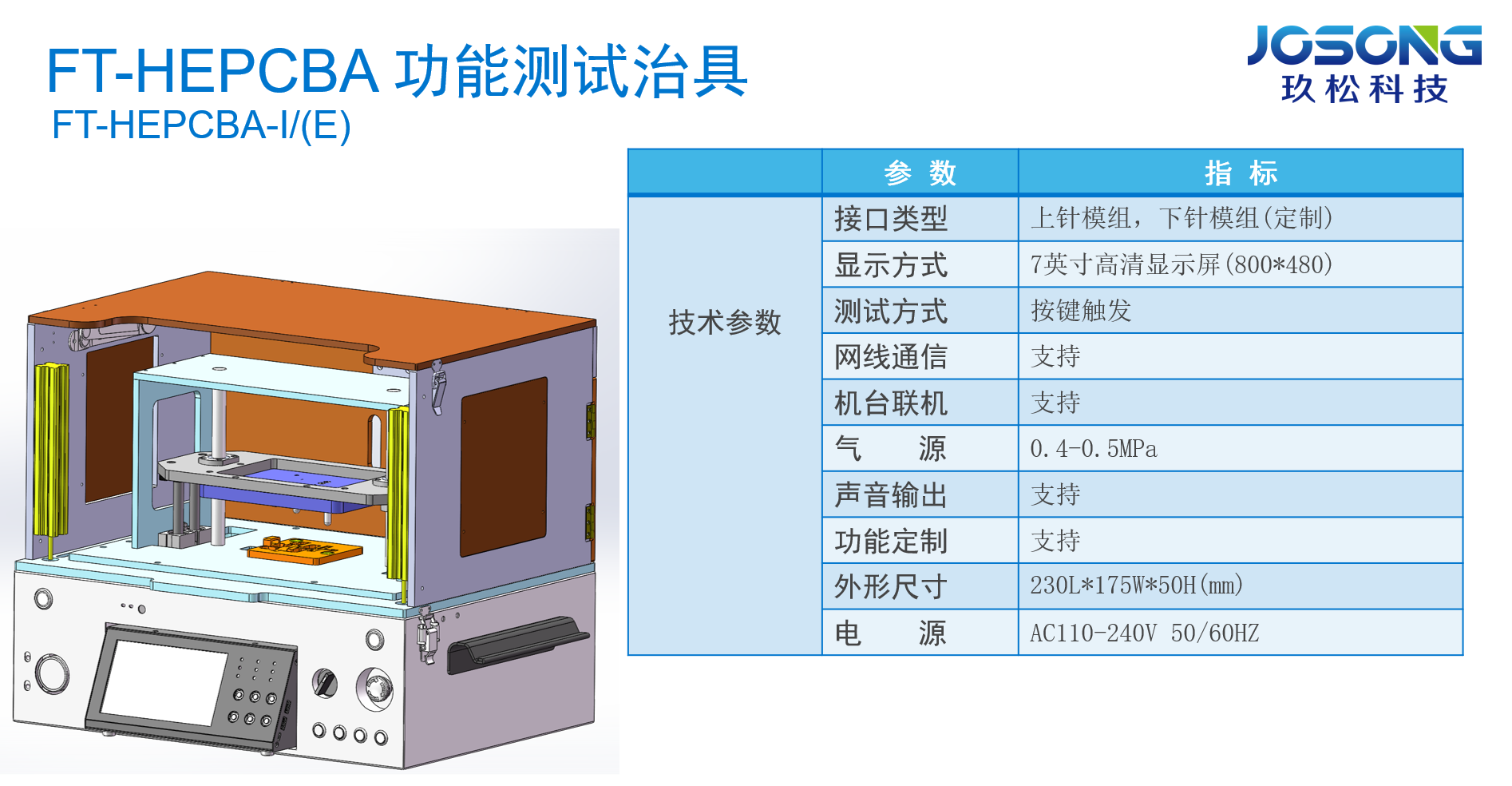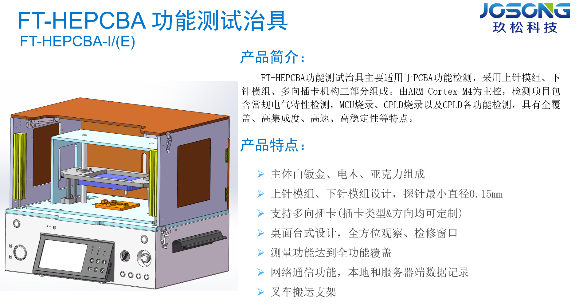 FT-HEPCBA功能测试治具主要适用于PCBA功能检测,采用上针模组、下针模组、多向插卡机构三部分组成。由ARM Cortex M4为主控,检测项目包含常规电气特性检测,MCU烧录、CPLD烧录以及CPLD各功能检测,具有全覆盖、高集成度、高速、高稳定性等特点。